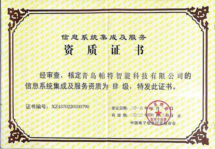 公司取得ISO9001認(rèn)證與信息系統(tǒng)集成及服務(wù)(四級)認(rèn)證,公司將系統(tǒng)集成、ISO9001和項目管理方法統(tǒng)一起來,將這些先進(jìn)的現(xiàn)代管理思想和現(xiàn)代管理體系有機地融為一體,建立了一套企業(yè)管理的標(biāo)準(zhǔn)方法,并與企業(yè)的業(yè)務(wù)流程集成在一起,形成了帕特智能的運營管理和質(zhì)量控制體系。